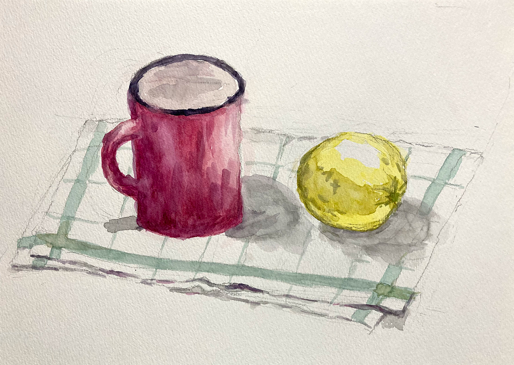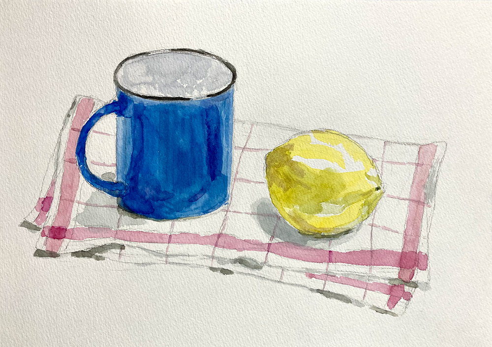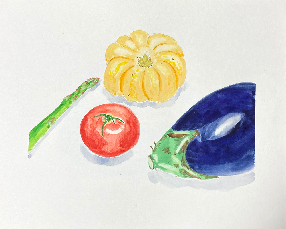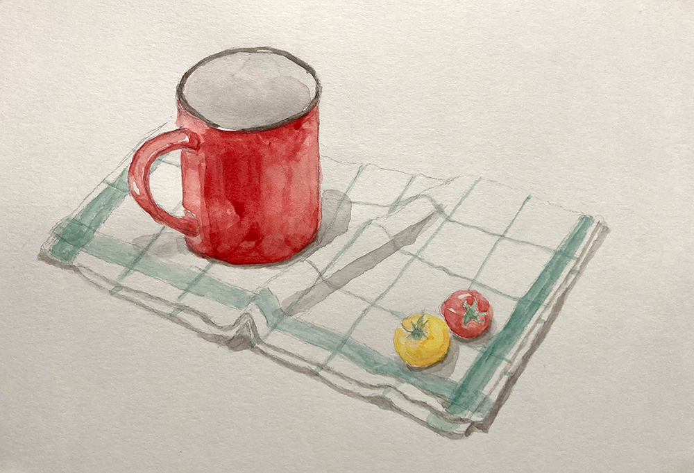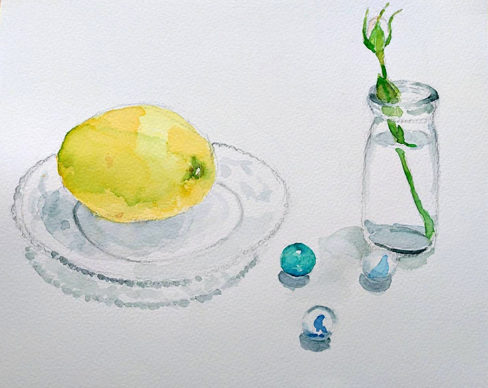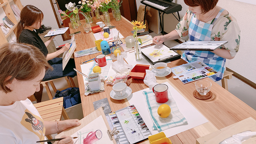 水彩教室、6月のレッスンの様子です。透明水彩絵の具を使って卓上の静物モチーフをデッサン・着彩していきます。