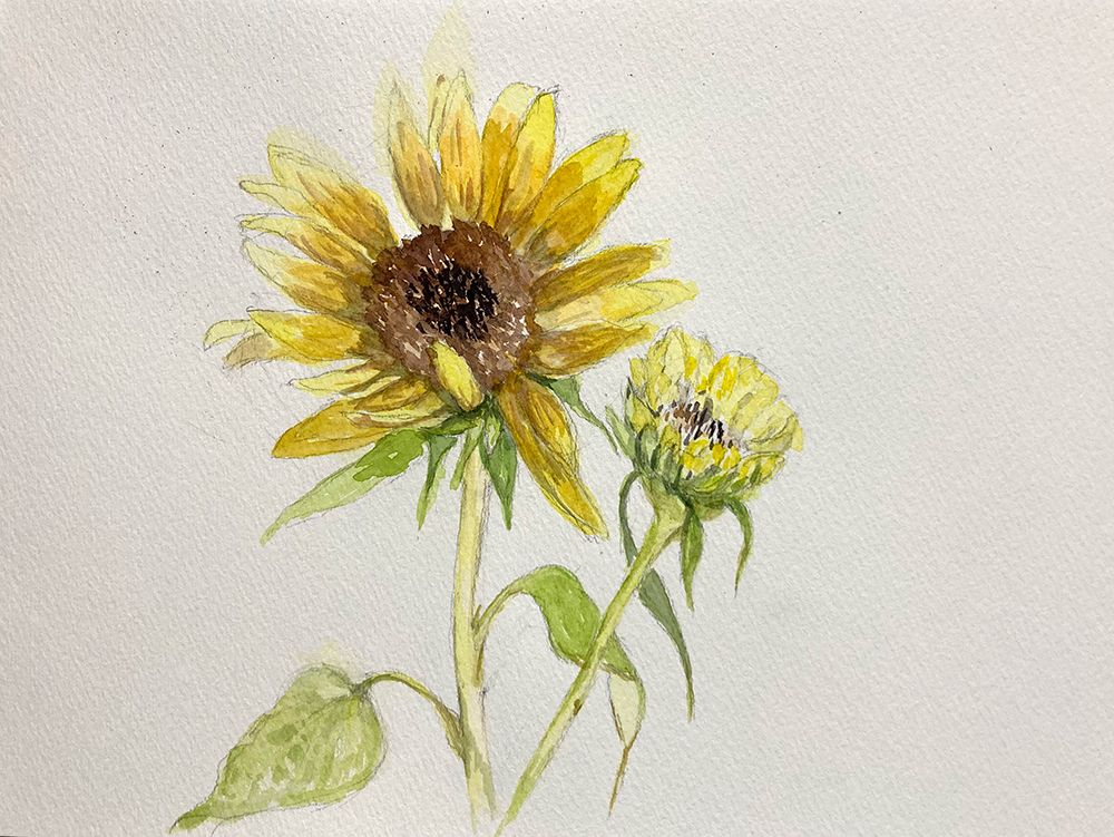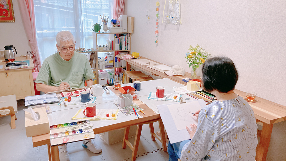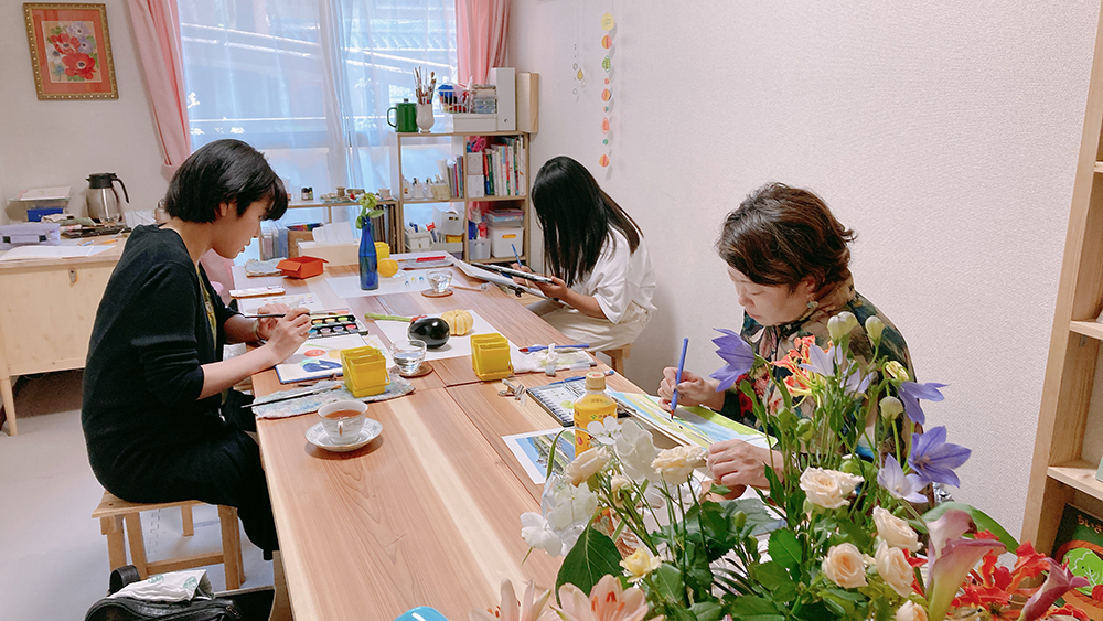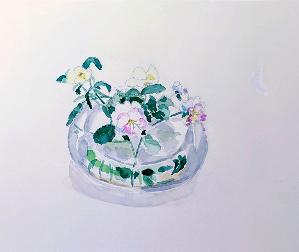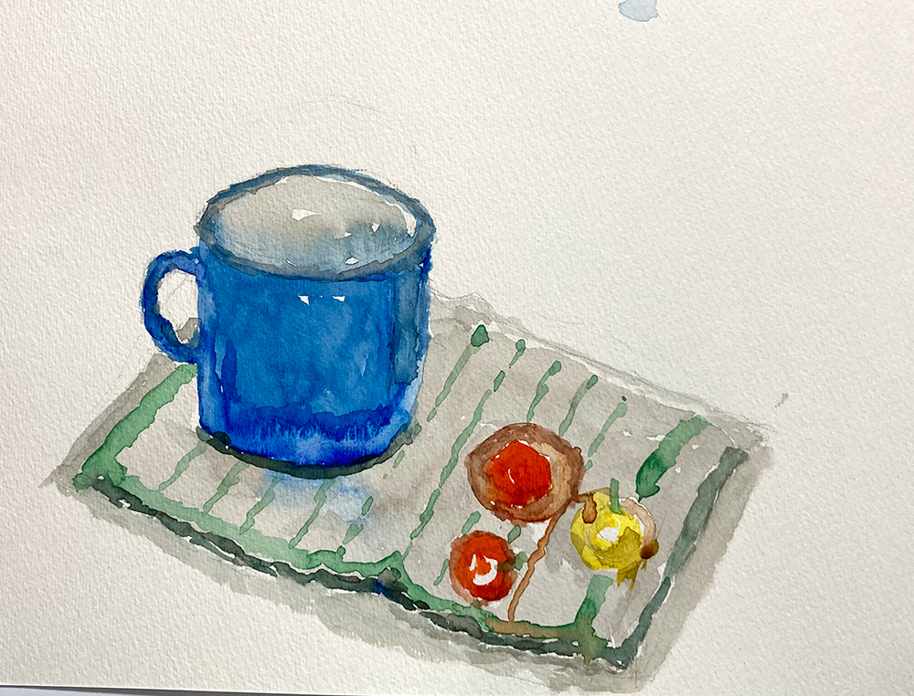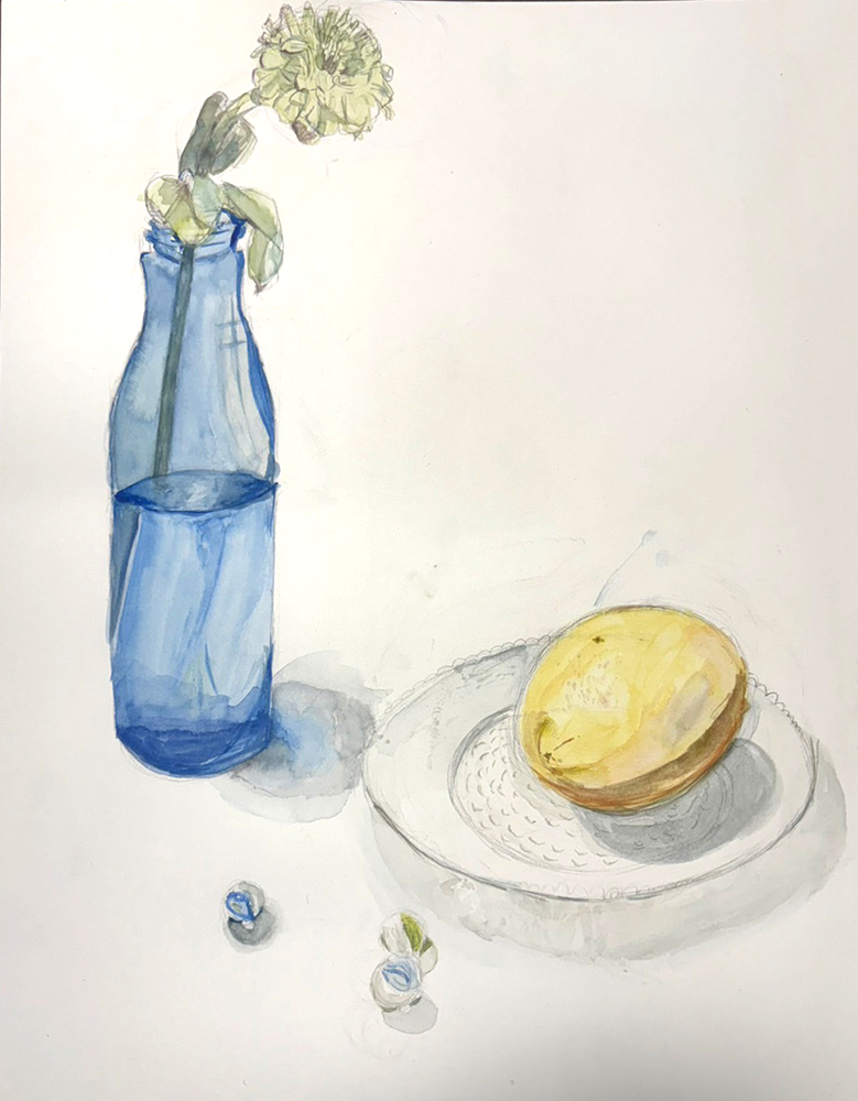 水彩教室、6月のレッスンの様子です。透明水彩絵の具を使って卓上の静物モチーフをデッサン・着彩していきます。