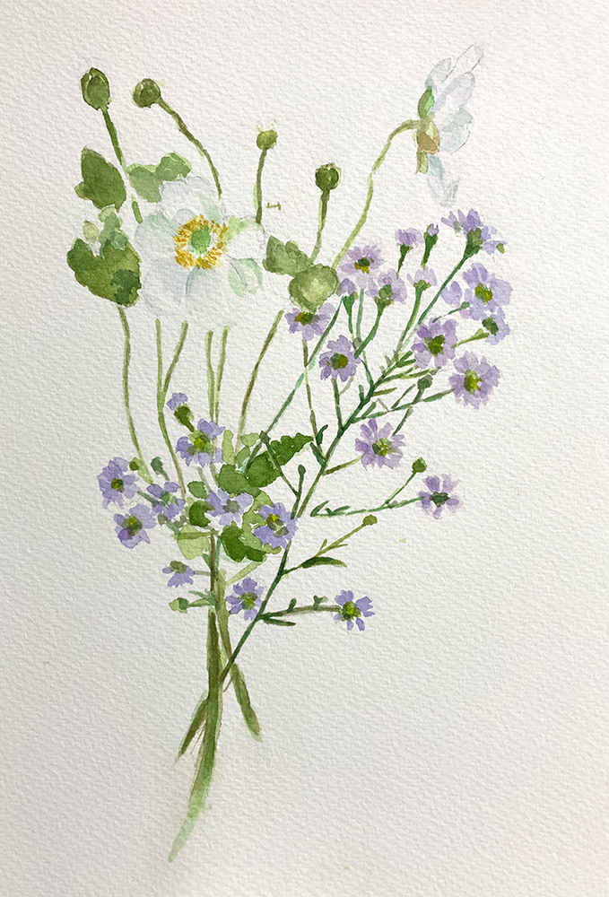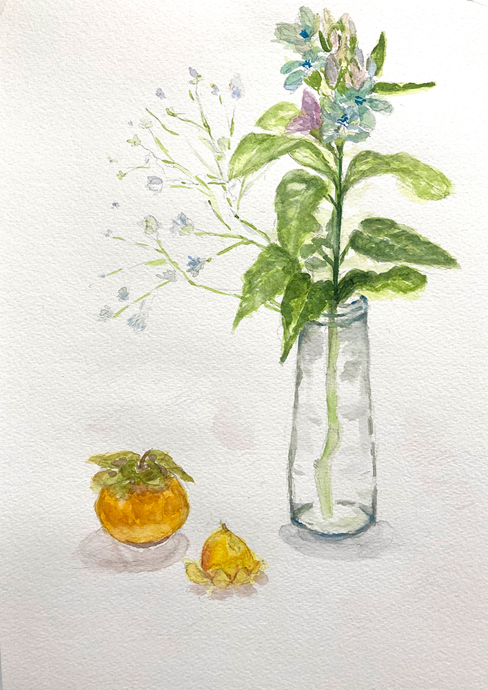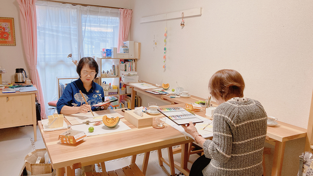 水彩教室、10月のレッスンの様子です。透明水彩絵の具を使って卓上の静物モチーフをデッサン・着彩していきます。