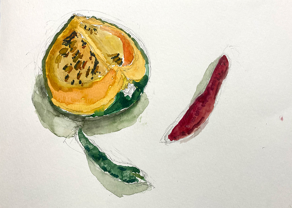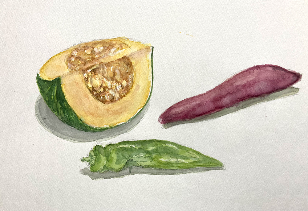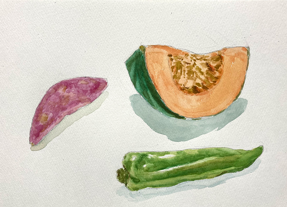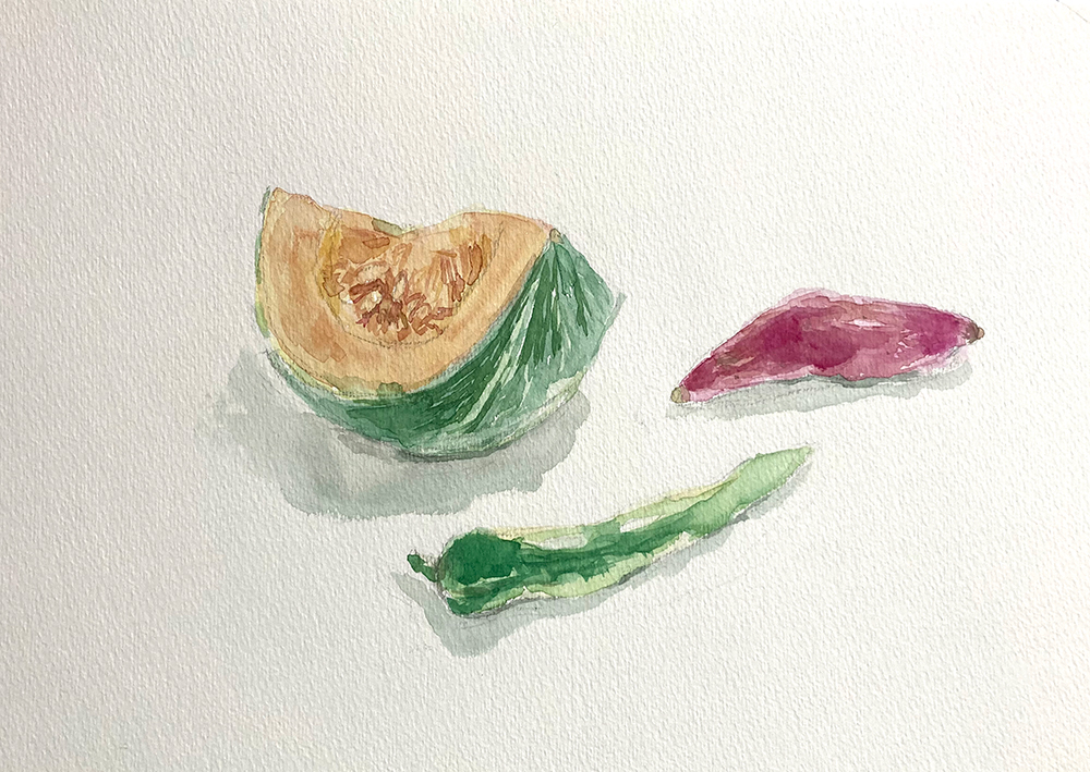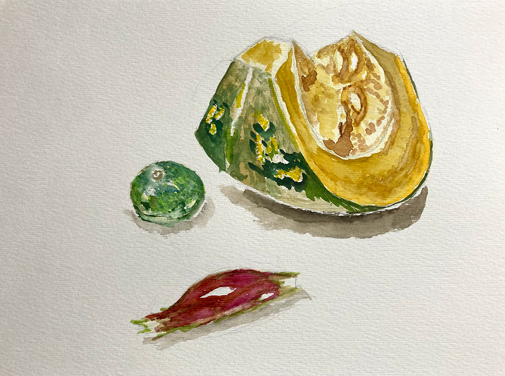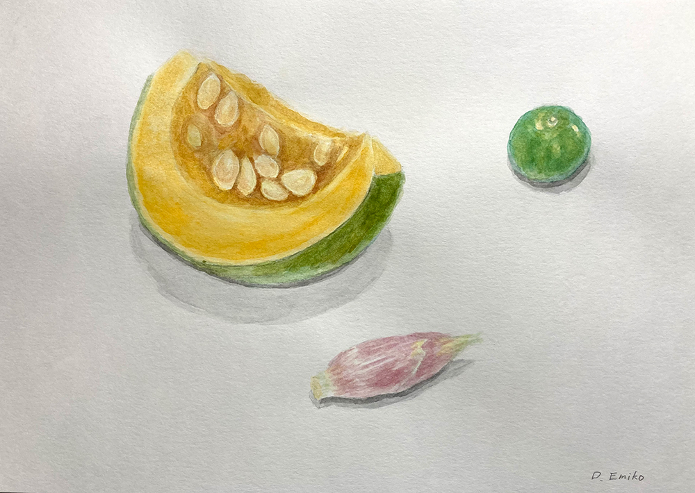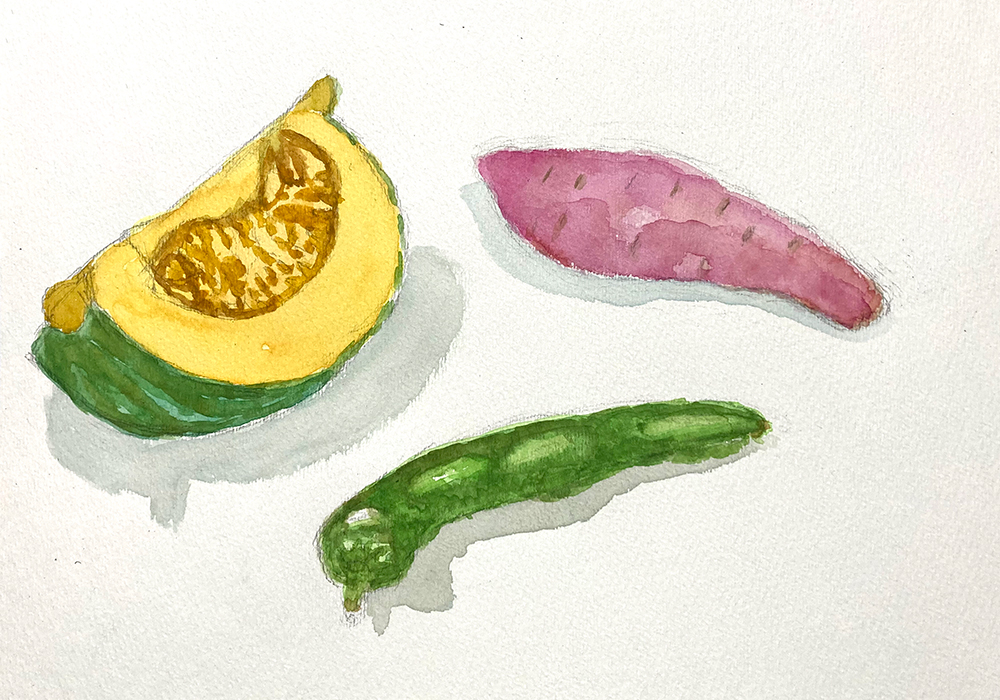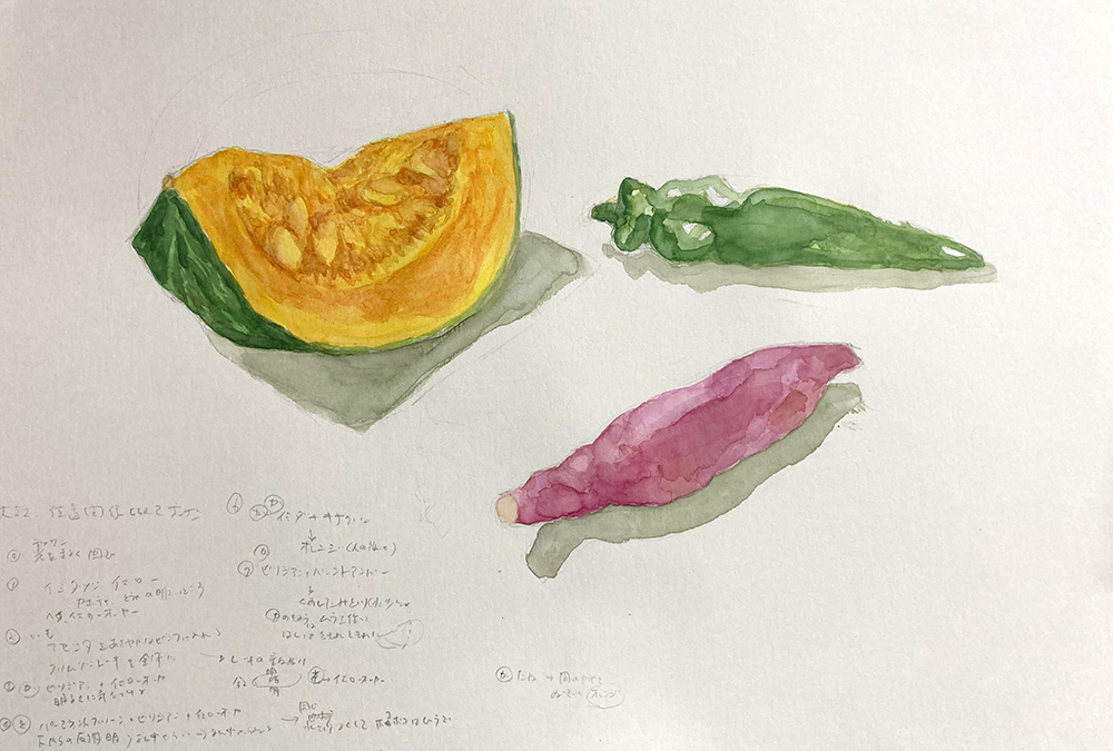 今月のモチーフは野菜。かぼちゃ、すだち、みょうが、万願寺とうがらしなど。レッスン2年目以降の方は自由です。