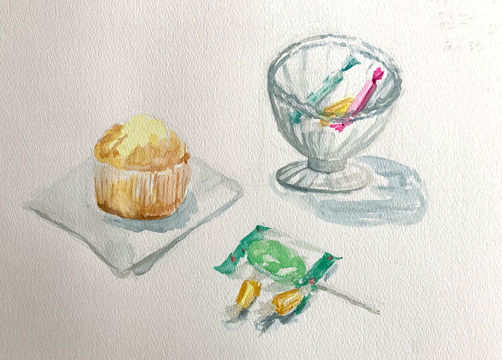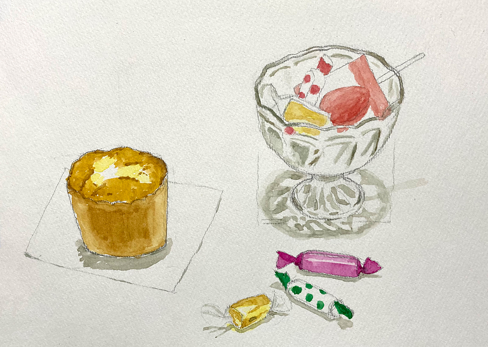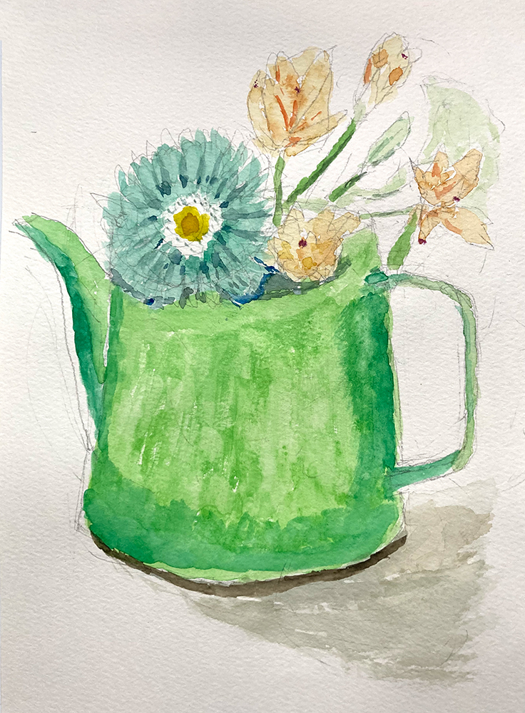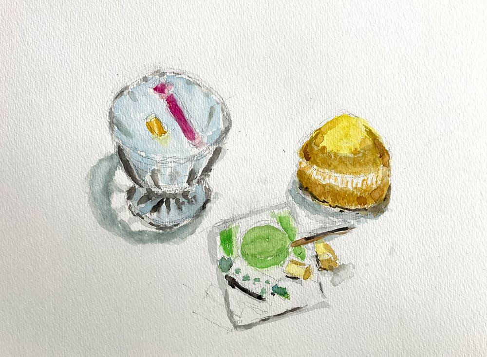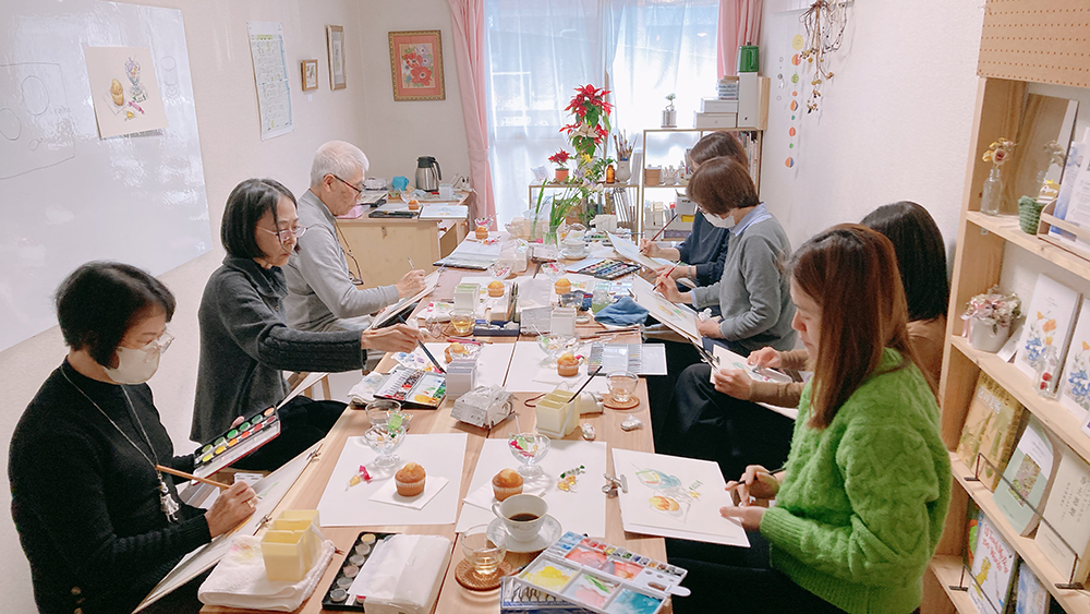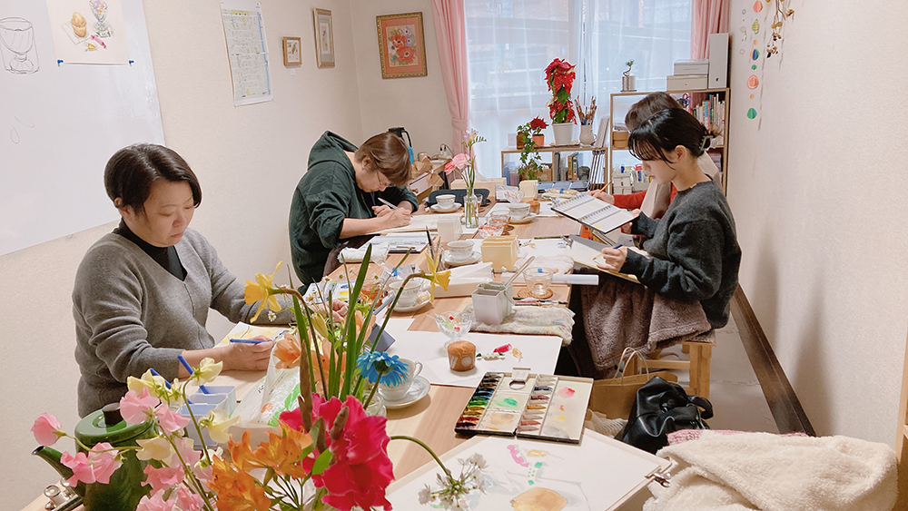 水彩教室、1月のレッスンの様子です。透明水彩絵の具を使って卓上の静物モチーフをデッサン・着彩していきます。