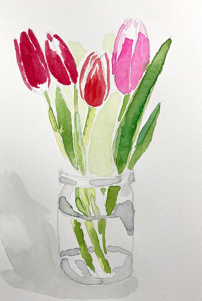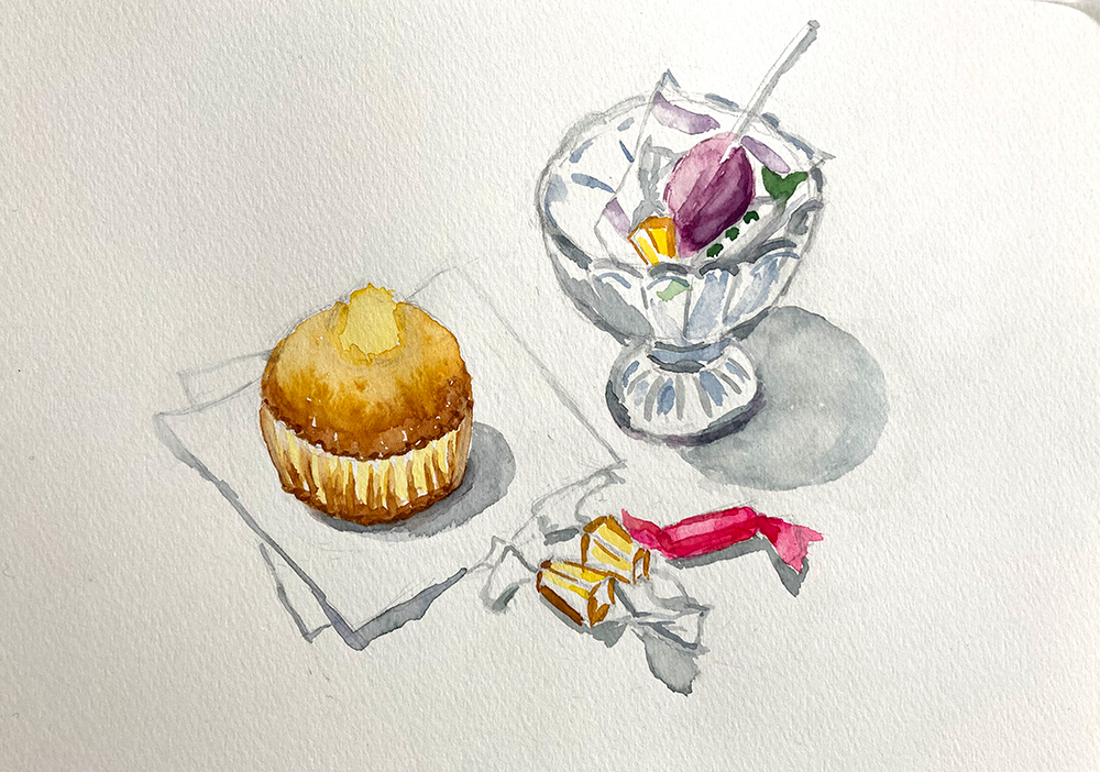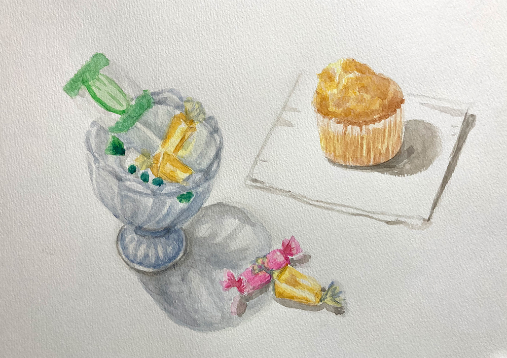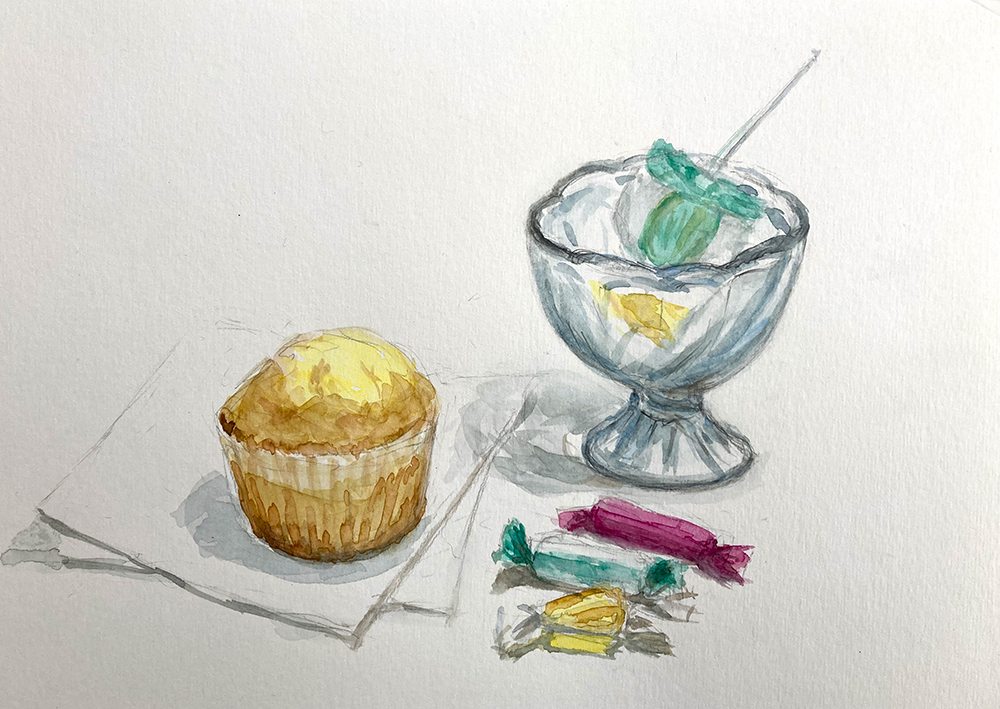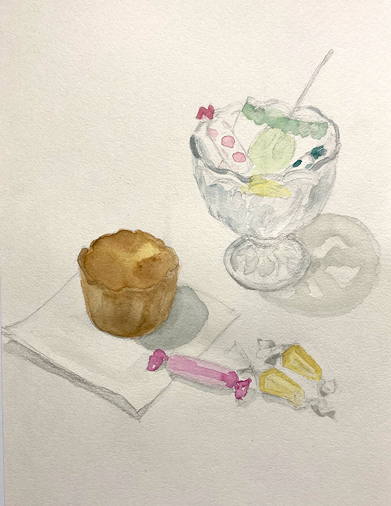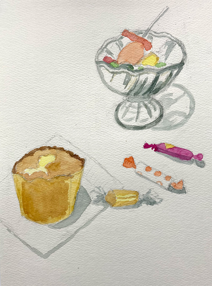 水彩教室、1月のレッスンの様子です。透明水彩絵の具を使って卓上の静物モチーフをデッサン・着彩していきます。